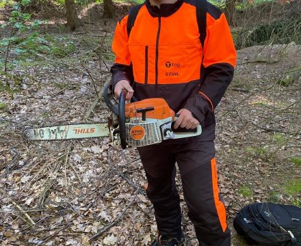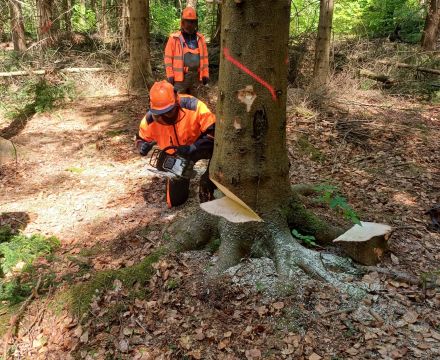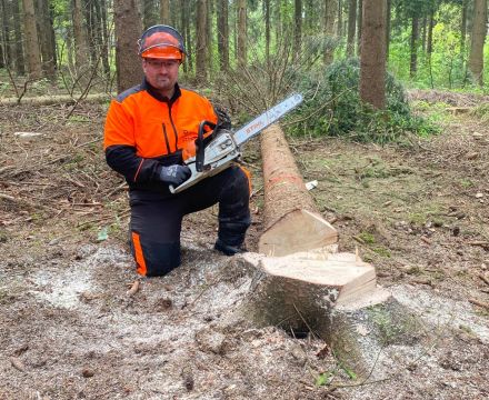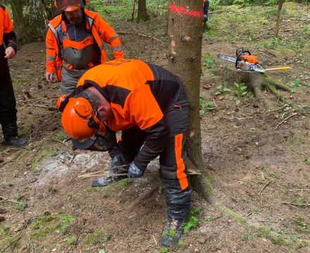Handelt es sich um Schwach- oder Starkholz, welche Fälltechnik ist anzuwenden, was sind Fallkerb, Bruchleiste oder -stufe? Wie sind Motorsäge, Handwerkzeuge und Hilfsgeräte zu handhaben? Welche Anforderungen der UVV (Unfallverhütungsvorschriften der Berufsgenossenschaft) sind zu beachten? Alle diese Inhalte waren Bestandteil von Lehrgang und Prüfung.